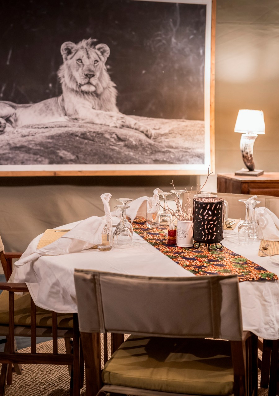 Le cœur du camp bat dans sa tente mess ou autour du feu. Deux espaces conviviaux où vous pourrez savourer de délicieux repas et partager vos aventures autour d’un verre. Les camps proposent une sélection de boissons, parfaites pour vous détendre après une journée de safari. La soirée, quant à elle, se termine dans une ambiance magique autour du feu de camp, sous un ciel parsemé d’étoiles à couper le souffle.